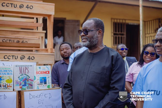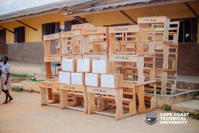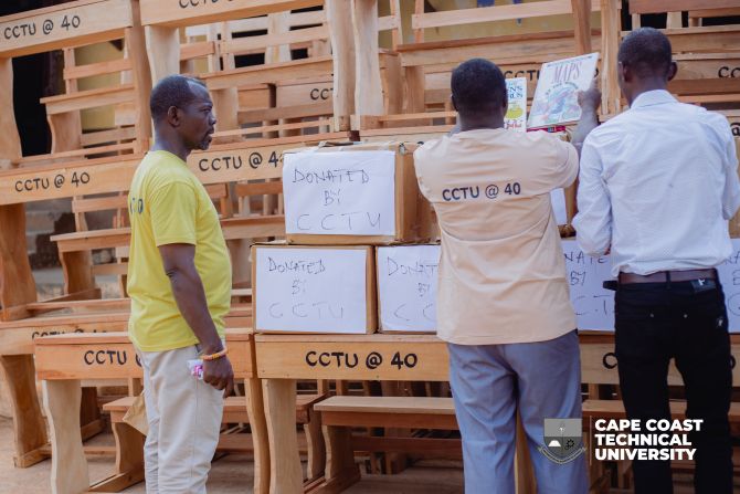Cape Coast Technical University (CCTU) has marked a significant milestone in its 40th Anniversary celebrations by donating twenty-five (25) dual desks and one hundred and fifty (150) textbooks to Ebubonko M/A Basic School in Cape Coast.